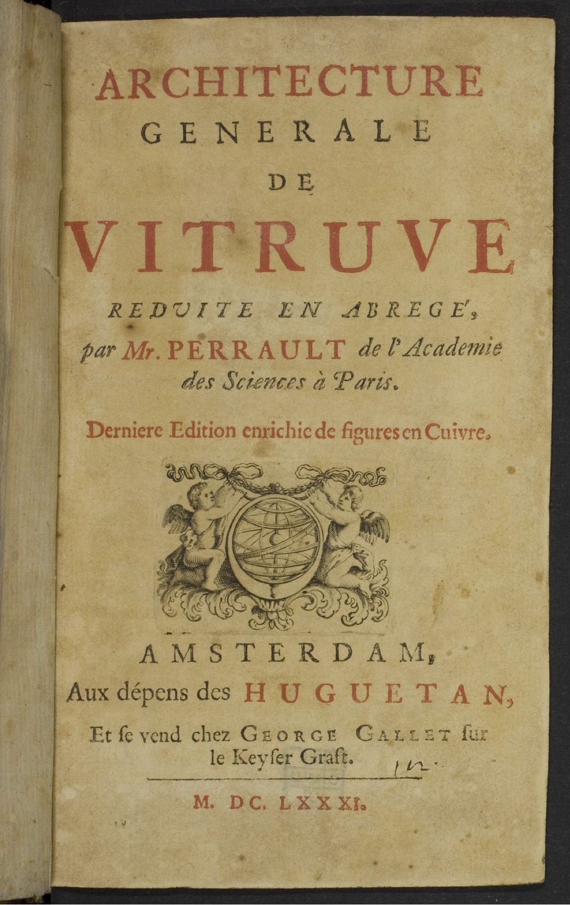 | Titelvariante | Architecture Generale De Vitruve Reduite En Abregé Par Mr. Perrault, de l'Academie des Sciences à Paris. Derniere Edition enrichie de figures en Cuivre. |